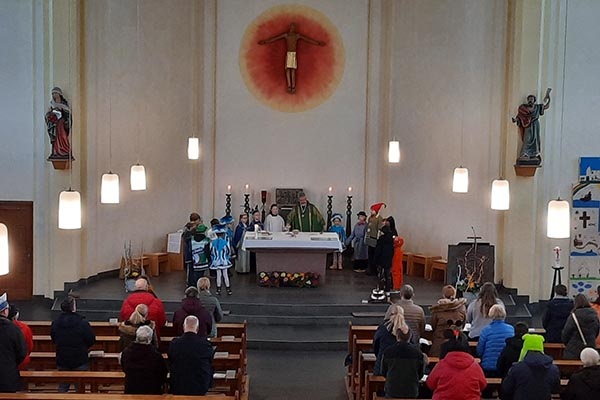 Als endlich Pastor Winkel, Messdienerin, Garde und Kinderprinzenpaar in die Kirche einzogen, ließen sie von oben Konfetti auf sie regnen. Und auch in den Kirchenbänken leuchteten einige der großen und kleinen Messbesucher*innen in ihren farbenfrohen Kostümen wie bunte Konfettischnipsel.
